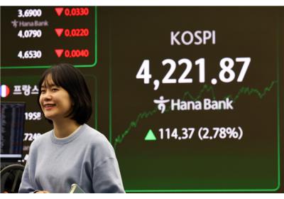 메뉴설정 홈 > 증권 > 증권일반 코스피, 장 초반 약세…코스닥은 상승 2025.11.04 09:20 코스가 4일 약보합 출발해 내림세를 보이고 있습니다. 한국거래소에 따르면 이날 오전 9시15분 기준 코스피는 전날보다 23.14포인트(0.54%) 하락한 4189.73을 나타내고 있습니다.... 코스피, 사상 첫 4200선 돌파…삼전·하이닉스 쌍끌이 랠리 2025.11.03 16:49 코스피가 하루 만에 3% 가까이 급등하며 사상 처음으로 4220선을 넘어섰습니다. 삼성전자(005930)와 SK하이닉스(000660)가 각각 11만원, 62만원을 돌파하면서 지수 상승을 견... 자사주 소각 부상…지주회사에 쏠리는 눈 2025.11.03 15:50 정부와 여당이 자사주 소각 의무화를 골자로 한 3차 상법 개정안 논의에 착수하면서 지주회사에 대한 관심도가 높아지고 있습니다. 자사주 소각은 주당 가치 상승과 주가 저평가... 리서치알음, KOSPI 4100…"무릎에 사서 어깨에 팔아라" 2025.11.03 15:49 리서치알음이 11월 시황 보고서에서 10월 한 달 코스피의 약진이 "정책·수급·금리 세 요인이 동시에 강하게 맞물린 결과"고 진단했다고 3일 밝혔습니다. 보고서는 이재명정부... 키움증권, 카카오뱅크서 주식계좌 개설 서비스 개시 2025.11.03 11:17 키움증권(039490)은 3일 카카오뱅크(323410)에 제휴 주식계좌 개설 서비스를 선보인다고 밝혔습니다. 이에 따라 카카오뱅크 앱 내 '증권사 주식계좌 개설' 메뉴를 통해 키움증권 ... (인사)IBK투자증권 2025.11.03 11:15 <임원 승진> ◇수석전무 △ S&T부문장 박태동 ◇전무 △ DT부문장 심완보 <임원 승진 및 신규선임> ◇상무 △ IB부문장 겸(兼) 구조화금융본부장 김병규 <임원 ... (인사)한양증권 2025.11.03 11:15 <선임> ◇ 센터장△CM센터장 강주용(상무)△전략자산운용센터장 양선우(이사) ◇ 부서장△채권운용부장 설근민(부장) [이토마토] 코스피 4000 시대, 와이즈 클럽 여인수 전문가와 함께 하시라 2025.11.03 10:51 코스피 4000 시대, 지혜로운 투자자가 승리한다이제 시장은 새로운 국면에 들어섰습니다.코스피 4000 돌파가 현실화된 지금, 단순한 상승장 대응만으로는 한계가 있습니다.변동...  시진핑-박진영 위원장 만남에 JYP엔터, 상승세 2025.11.03 09:40 시진핑 중국 국가주석과 박진영 대중문화교류위원장의 만남에 JYP Ent.(035900)가 상승하고 있습니다. 3일 한국거래소에 따르면 오전 9시33분 기준 JYP엔터테인먼트는 ... 코스피, 강세 출발…코스닥도 상승 2025.11.03 09:23 3일 장 초반 코스피가 강세로 출발해 4150선을 나타내고 있습니다. 한국거래소에 따르면 코스피는 이날 오전 9시15분 기준 전날보다 49.12포인트(1.1%) 오른 4156.62를 기록 중입... [IB토마토]브룩필드, 미래에셋 계약금 미지급 논란…글로벌 신뢰 '흔들' 2025.11.03 06:00 미래에셋자산운용은 미지급된 계약금 관련 브룩필드자산운용에 대한 법적 조치를 예고했다. 싱가포르국제중재센터(SIAC)의 계약금 반환 판단에도 불구하고 브룩필드가 이에 어... (주간증시전망)4000 돌파한 코스피…대형주 랠리 속 순환매 본격화 주목 2025.11.02 00:00 지난 주 코스피가 사상 처음 4000선을 돌파하며 강세장을 이어갔습니다. 미·중, 한·미 무역 협상 타결 기대감과 미 연준의 금리 인하 전망이 맞물리며 투자심리가 크게 개선... ‘CB 발행→전환가 낮추기→주가 반등’ HLB가 또?! 2025.11.01 06:00 HLB는 매년 대규모 전환사채(CB)와 신주인수권부사채(BW)를 발행, 회사에 필요한 자금을 조달하고 있습니다. 해당 메자닌을 인수하는 투자자들은 사모펀드와 기관, 또 누군지도 알 ... [IB토마토](IPO클립)세나테크놀로지, 공모가 상단 확정…코스닥 데뷔 초읽기 2025.10.31 17:59 무선통신기 전문기업 세나테크놀로지가 코스닥 상장을 위한 기업공개(IPO) 수요예측에 흥행하면서 공모가액이 희망공모가 최상단인 5만6800원으로 확정됐다. (사진세나테... [IB토마토](Deal클립)HL홀딩스, 1300억원으로 증액…언더 발행도 성공 2025.10.31 17:33 HL홀딩스(060980)가 공모채 수요예측 흥행에 힘입어 증액 발행과 언더 발행 모두 성공했다. 31일 금융감독원 전자공시시스템에 따르면 HL홀딩스는 800억원 규모 무기명식 이... 미래에셋그룹, 임원 승진 인사 단행 2025.10.31 17:17 미래에셋그룹이 31일 임원 승진 인사를 실시했다고 밝혔습니다. 이번 인사는'‘Mirae Asset 3.0' 시대를 여는 출발점으로, AI·Digital·Global 등 핵심 비즈니스 영역의 경... 내 주식만 안 올라…"이제 코스닥 집중할 때" 2025.10.31 17:10 코스피가 사상 처음으로 4100선을 넘어섰습니다. 증권가에서는 대형주 랠리가 막바지에 이르렀다며 향후 코스닥 자금 순환 가능성에 주목하고 있습니다. 내년 금리 인하와 정책 ... 코스피, 사상 첫 4100선 마감 2025.10.31 17:05 코스피가 31일 종가 기준으로 사상 처음 4100선을 넘어섰습니다. 전날 아시아태평양경제협력체(APEC) CEO 서밋에 참석한 젠슨 황 엔비디아 최고경영자(CEO)가 이재용 삼성전자...  LG이노텍, 3분기 호실적에 강세 2025.10.31 09:43 LG이노텍(011070)이 올 3분기 실적 호조 영향에 강세를 나타내고 있습니다. 31일 한국거래소에 따르면 LG이노텍은 이날 오전 9시40분 기준 전 거래일 대비 1만5500원(6.78%) 오... [이토마토] 투자의 타이밍을 잡는 법, 금산이 알려드립니다 2025.10.31 09:24 금산, 실전 감각을 키우는 투자 교육으로 