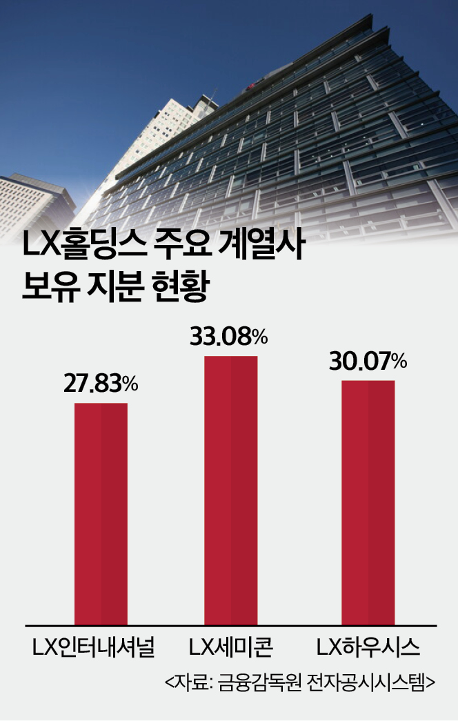 LX그룹의 향후 과제는 LX홀딩스와 계열사 간 결속력 강화다. LX홀딩스의 핵심 관계사 지분율은 LX인터내셔널 27.83%, LX세미콘 33.08%, LX하우시스 30.07%다. 국제회계기준(IFRS)에 따르면 지분이 20~50% 미만일 때는 관계기업으로 분류돼 지분법 평가가 적용된다. 지분율이 과반에 미치지 않아 종속 편입이 어려운 상황이다.