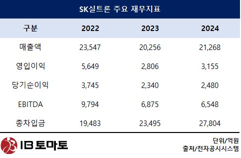 SK실트론 입장에선 차입금 부담이 증가할수록 안정적인 현금창출력을 근거로 몸값을 지켜야 하는 입장이지만, 반도체 업황이 최근 몇 년간 부진하면서 EBITDA 규모도 축소됐다. SK실트론의 최근 3년간 EBITDA는 2022년 9794억원에서 2023년 6875억원, 2024년 6548억원이다. 영업이익률도 같은 기간 24.0%, 13.9%, 14.8%로 떨어졌다.