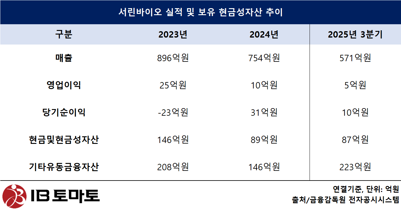 서린바이오의 연간 매출은 2022년 1047억원, 2023년 896억원, 2024년 754억원으로 감소세를 보이고 있으며, 2025년 3분기 누적 매출도 571억원으로 집계돼 추가적인 성장 동력 확보가 필요한 시점이다.