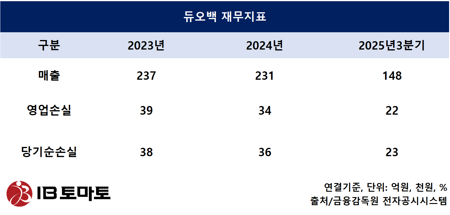 이와 관련, 듀오백 관계자는 <IB토마토>와의 통화에서 “실적 부진 원인 중 하나는 원가 부담이지만, 이는 단일 요인이라기보다 외부 환경 변화와 내부 사업구조 조정 과정이 복합적으로 작용한 결과로 보고 있다"며 ”현재는 원가 절감, 제품 포트폴리오 재정비, 고정비 효율화 등을 통해 수익성 개선 기반을 단계적으로 구축하고 있다“고 말했다.