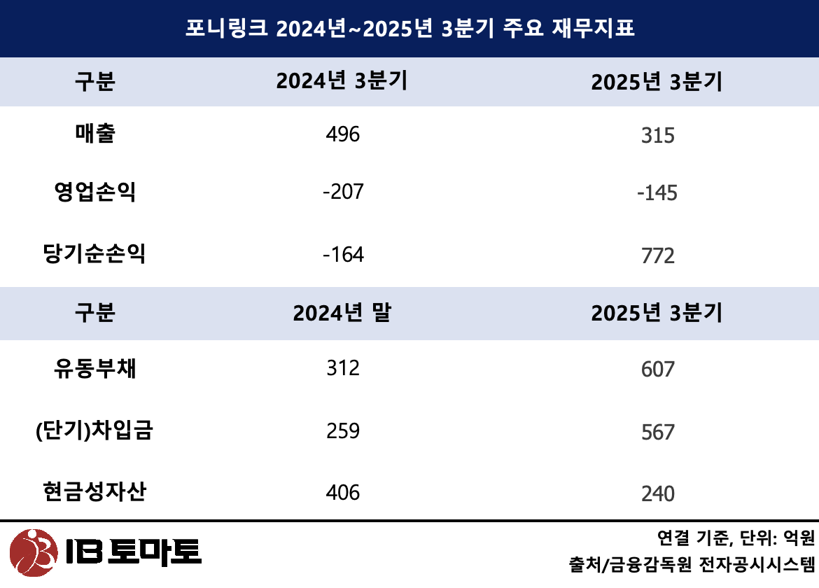 재무건전성 역시 악화되고 있다. 3분기 포니링크의 유동부채는 607억원으로 지난해 말 312억원 대비 두 배 가까이 급증했다. 특히 유동차입금은 567억원으로 전년 말 259억원 대비 두 배 이상 폭증했다. 반면 회사가 당장 동원할 수 있는 현금및현금성자산은 240억원 수준에 불과해, 가용 현금보다 상환해야 할 단기 빚이 두 배 이상 많은 상태다.