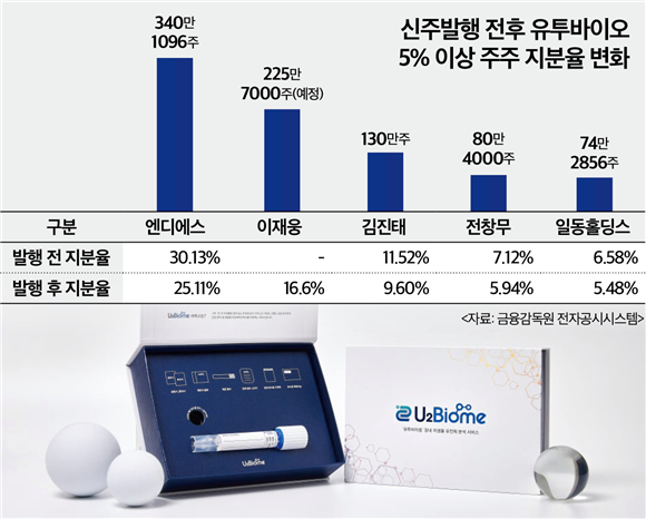 유증 납입일 및 타법인주식 양수예정일자는 11월6일이다. 공시된 계획대로 유증 및 주식 양수가 이뤄지면 이 전 대표는 유투바이오 지분 16.66%를 보유하게 되며 단숨에 2대주주의 지위를 획득하게 된다. 반면 유투바이오의 현 최대주주 엔디에스의 지분율은 30.13%에서 25.11%로 하락하게 된다.