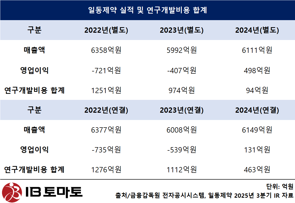 다만 R&D로 인한 재무적 부담이 모회사에서 자회사로 옮겨갔을 뿐 그 비용이 완전히 없어진 건 아니다. 일동제약의 연결기준 연구개발비는 2022년 1276억원(매출 대비 20%), 2023년 1112억원(매출 대비 18.5%), 2024년 463억원(매출 대비 7.5%)등 별도기준 비용에 비해 감소폭이 더딘 것을 확인할 수 있다.