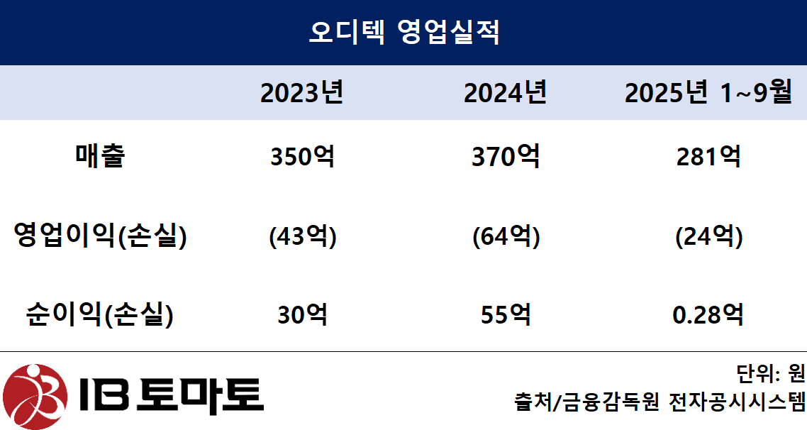 오디텍은 반도체제조공정(FAB)을 바탕으로 비메모리반도체 칩과 센서, 센서모듈, 시스템의 수직계열화된 제품을 생산하고 있다. 올해 1~9월 매출은 전년 동기 대비 1.8% 감소한 281억원, 영업손실은 전년 동기 대비 8.3% 증가한 24억원을 기록했다.