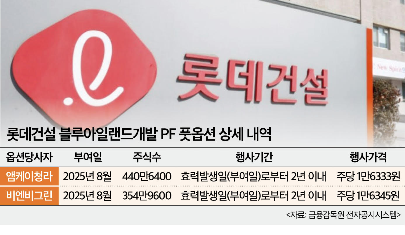 구체적으로 롯데건설은 엠케이청라가 보유한 블루아일랜드개발 지분 440만6400주를 주당 1만 6333원에, 비엔비그린이 보유한 354만9600주를 주당 1만 6345원에 각각 매입해주는 조건으로 풋옵션을 부여했다. 옵션 행사 기간은 계약 체결일로부터 2년 이내다.