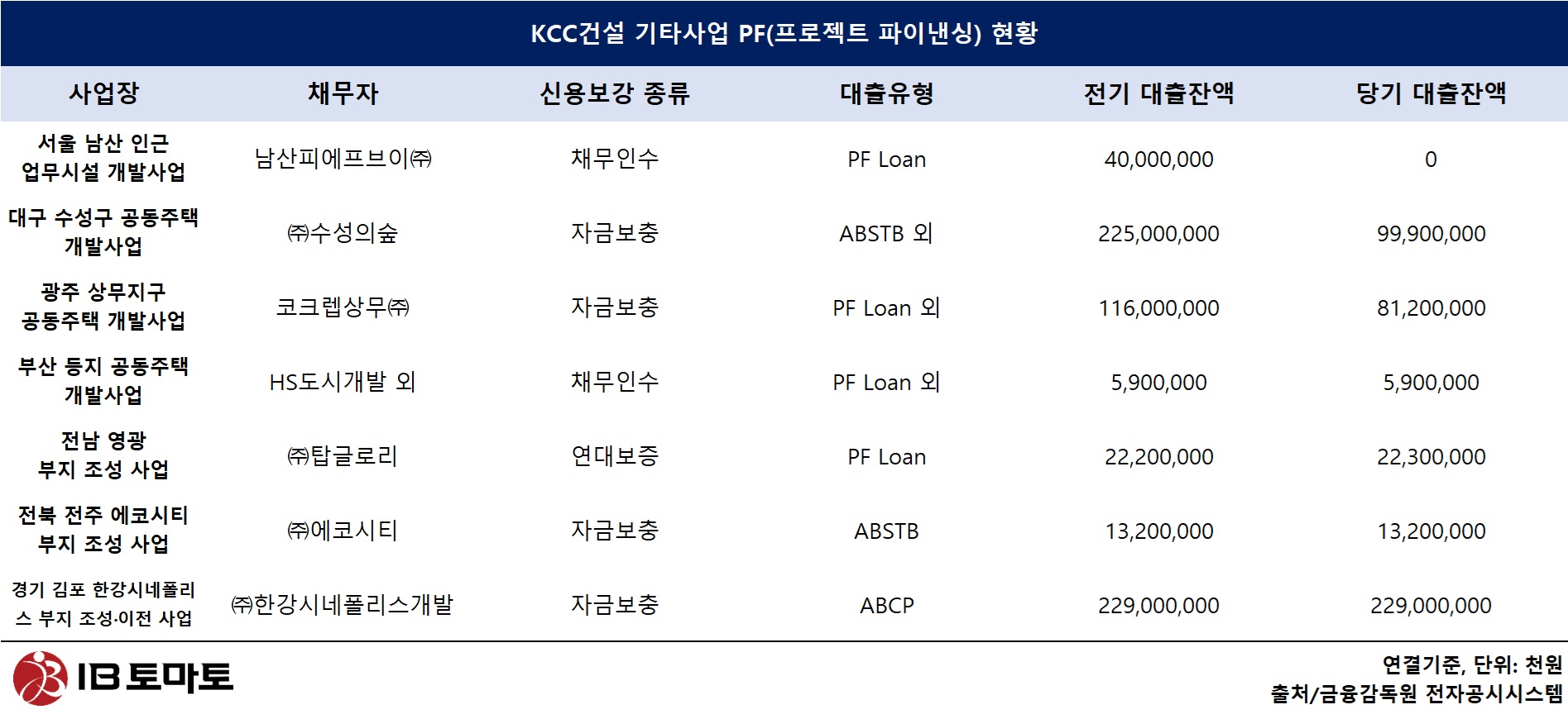 그간 KCC건설의 PF 구조는 시공 역할을 넘어 금융 리스크까지 함께 떠안는 방식이 적지 않았다. 주택·기타사업을 중심으로 자금보충이나 채무인수, 분양가 보장성 약정이 반복적으로 포함되며, 사업 성과가 악화될 경우 공사 지연과 무관하게 금융 부담이 곧바로 현실화되는 구조였다.