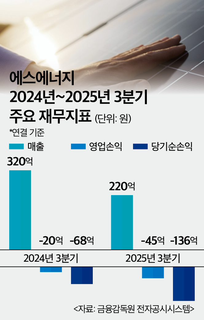 에스에너지의 이 같은 위기는 근본적으로 악화된 실적에서 비롯됐다. 에스에너지의 3분기 매출액은 약 220억원으로 전년 동기(약 320억원) 대비 31% 급감했다. 수익성 지표는 더욱 심각한 상태다. 3분기 영업손실은 약 45억원으로 전년 동기(약 20억원 손실)보다 적자 폭이 두 배 이상 확대됐다. 3분기 누적 당기순손실은 약 136억원에 달해 전년 동기(약 68억원 손실) 대비 100% 증가하며 경영 환경이 급격히 냉각된 상태다.