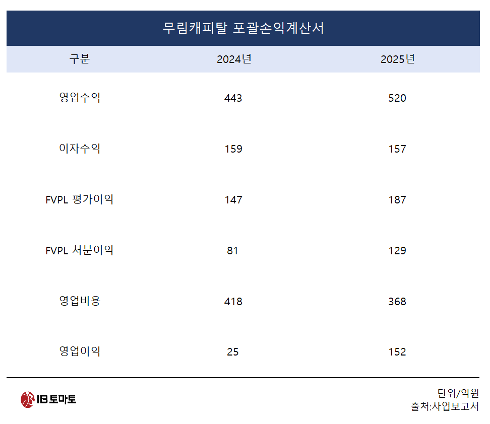 [IB토마토 황양택 기자] 무림캐피탈이 지난해 영업이익과 순이익을 크게 개선했다. 수익이 증가한 가운데 비용이 감소하면서 양방향으로 실적을 회복했다. 다만 여신전문금융 본업에 해당하는 이자수익은 오히려 부진했고, 투자영업 부문인 금융자산 평가손익과 처분손익 증가가 실질적인 역할을 다했다. 조달 부담으로 본업에서는 성장성이 뒤떨어지고 있다.