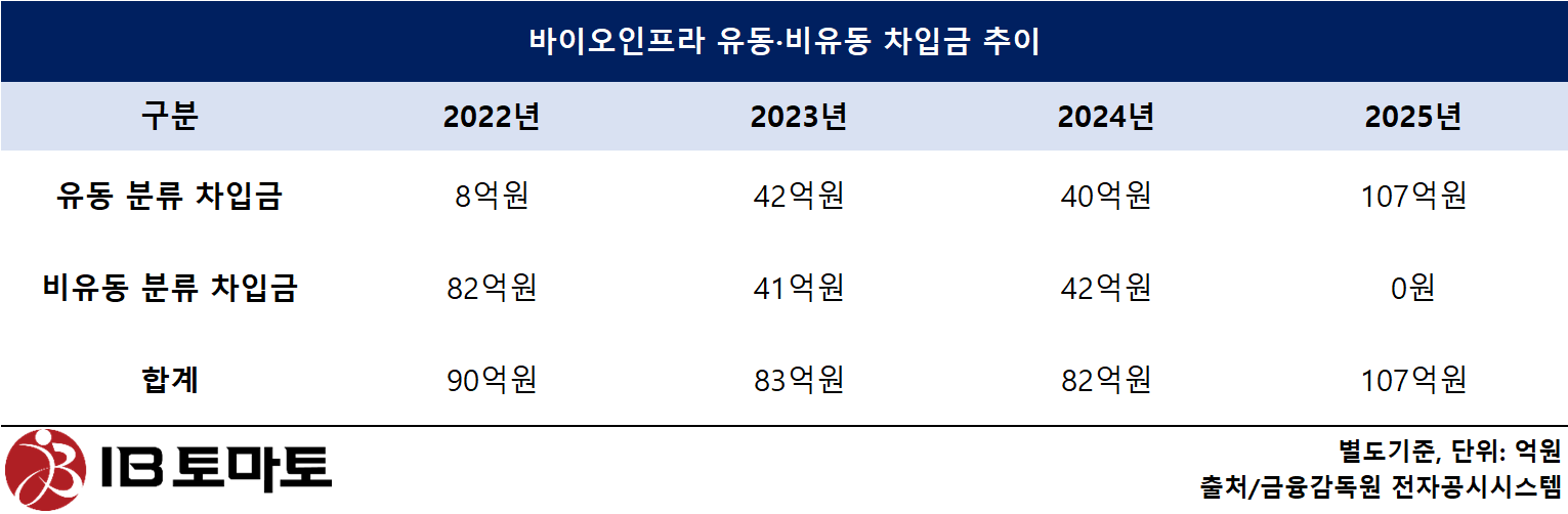 2024년 기준 바이오인프라의 차입금은 장기차입금 42억원과 유동분류 차입금 40억원으로 구성돼 있었다. 그러다 지난해 들어 기존에 국민은행에서 빌린 장기차입금 42억원의 만기가 1년 이내로 다가오면서 유동성 대체가 이뤄졌다.